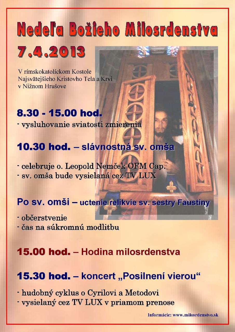 Druhá veľkonočná nedeľa je každoročne nedeľou veľkých milostí – Nedeľou Božieho milosrdenstva. Pri tejto príležitosti navštívia našu farnosť aj slovenské kresťanské médiá. Rádio Lumen ponúkne v priamom prenose o 15.00 Hodinu milosrdenstva. Slávnosť bude priamo z Nižného Hrušova naživo prenášať aj Televízia LUX. Priamy prenos začne dokumentom a živým vstupom z našej farnosti od 10.00 hod. Po ňom o 10.30 začne slávnostná svätá omša. O 15.00 bude TV LUX prenášať naživo Hodinu milosrdenstva a po nej taktiež ponúkne priamy prenos z koncertu Posilnení vierou o sv. Cyrilovi a Metodovi v podaní orchestra a speváckeho zboru Juventus z Brezna. Veríme, že ak nebudete môcť byť prítomní slávnosti priamo u nás, nenecháte si ju ujsť prostredníctvom televíznych a rozhlasových prijímačov. Oba prenosy je možné sledovať aj na internetových stránkach Rádia Lumen a TV Lux.